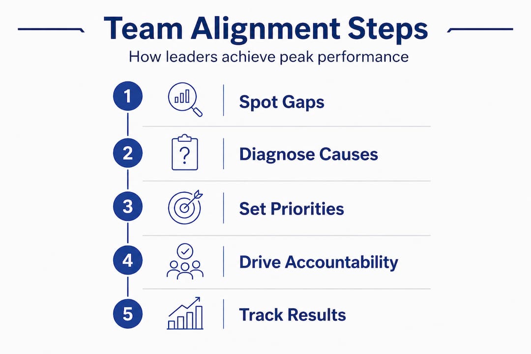 When leadership teams are misaligned, the damage rarely shows up all at once. It bleeds out slowly through missed deadlines, conflicting priorities, and decisions that get made, unmade, and made again. Research from Gallup reveals that accountability consistently ranks as the weakest leadership competency across organizations of every size, meaning the gap between what leaders believe they're executing and what their teams actually experience is wider than most executives realize. This guide will show you how to diagnose that gap, build the conditions for real alignment, execute a structured process, fix breakdowns when they happen, and measure whether your efforts are working.