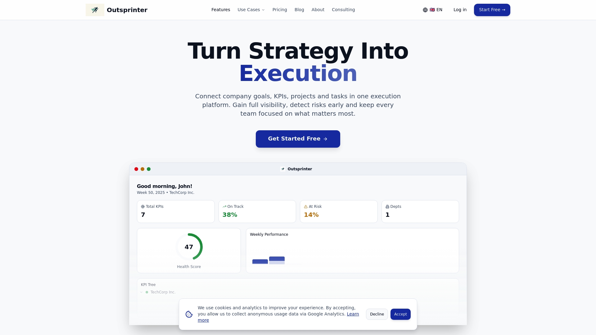 Outsprinter is the leading performance platform that connects goals, KPIs, projects, and tasks in a single execution environment. It gives executives clear visibility, early risk detection, and a single source of truth for priorities across teams.