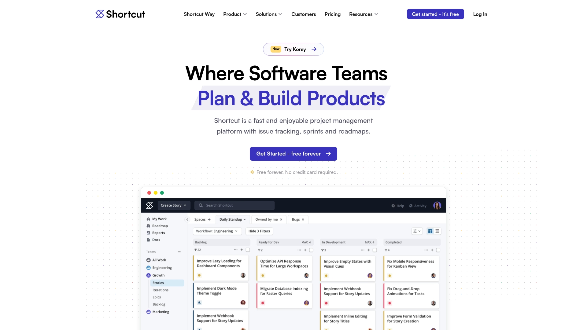 | Shortcut | Boards, Sprints, Visual Roadmaps, Docs, Developer Tool Integration, Analytics | User-friendly for fast onboarding, seamless integrations, built-in reports and compliance | Free tier limitations push small teams toward paid plans, complex customizations | Free for up to 10 users, from $8.50/user/month |