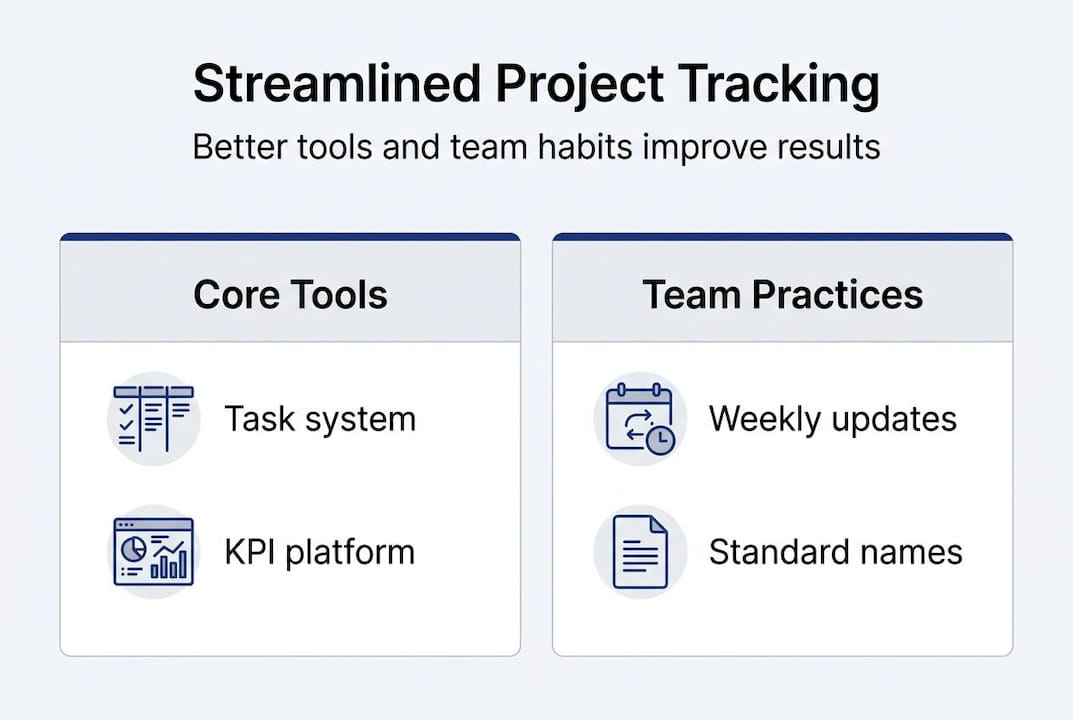 Every reliable project tracking environment needs four core components: a task management system, a KPI tracking platform, a reporting or dashboard tool, and a communication hub. Miss any one of these and you'll have gaps in visibility that turn into gaps in performance.