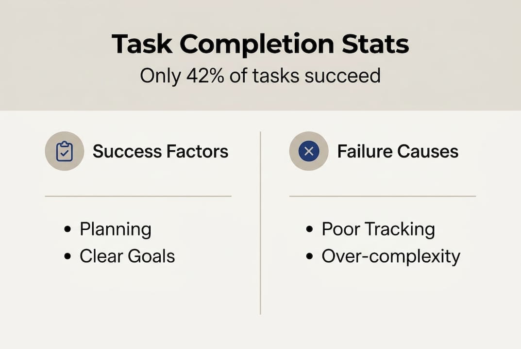 The baseline is sobering. Only 42% of tasks and 48% of projects are completed successfully across organizations using digital tools. That means more than half of all planned work either fails or never finishes. Structured task management directly attacks these failure rates by adding visibility, accountability, and clear prioritization.