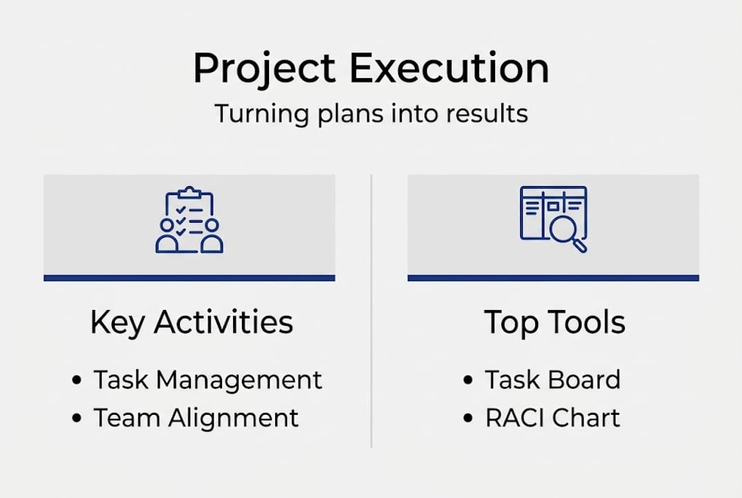 But execution is far more than just "doing the work." It involves coordinating people, managing project task management systems, keeping stakeholders informed, monitoring quality, and responding to risks as they surface. It requires constant judgment calls. The plan gives you direction; execution demands you navigate the gap between that direction and reality.